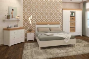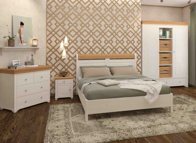 1. Кровать (спальное место 1400 х 2000 мм, ШхДхВ: 1470 x 2170 x 1100 мм). Основание - ортопедическое (решетка на каркасе), включено в стоимость комплекта мебели. Матрас не входит в стоимость и приобретается отдельно