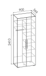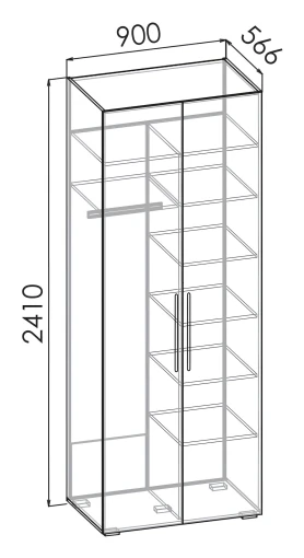 2 секции. В левой - 2 полки и штанга для вешалок, в правой - 6 полок