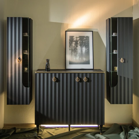 скрытые части ЛДСП, видимые части МДФ в пленке, задняя стенка ХДФ