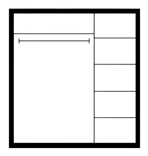 2 секции. В левой - штанга для вешалок и полка, в правой - 4 полки