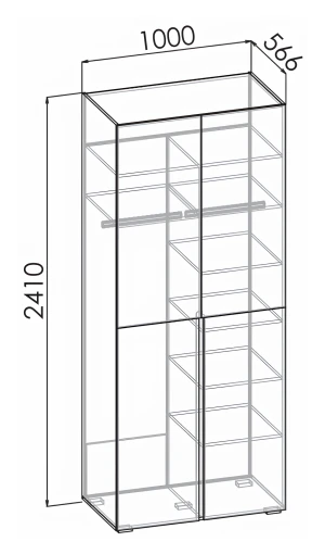 2 секции. В левой - 2 полки и штанга для вешалок, в правой - 6 полок и штанга для вешалок