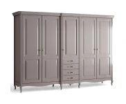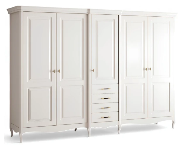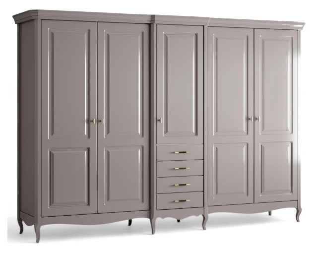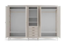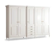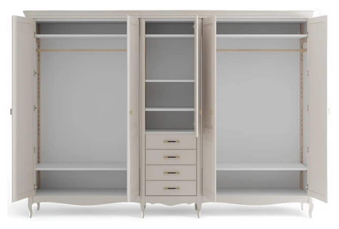 3 секции. В левой и правой - штанга для вешалок и 2 полки, в центральной - 3 полки и 4 выдвижных ящика