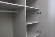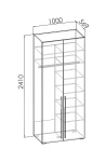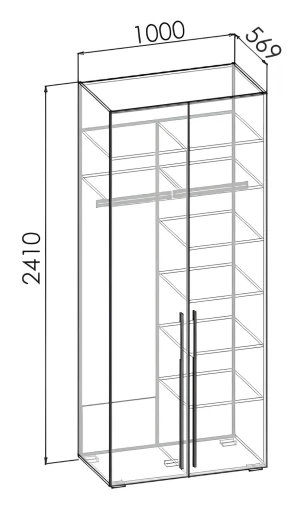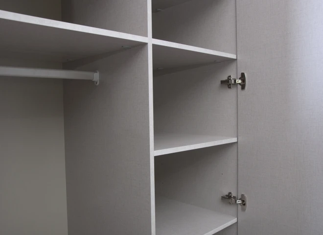 2 секции. В левой - полка и штанга для вешалок, в правой - 5 полок и штанга для вешалок. 1 полка по ширине шкафа